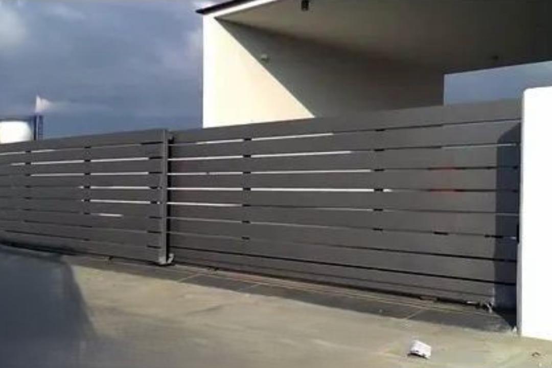 It uses dual-sliding panels that move seamlessly in opposite or parallel directions. This synchronized movement allows the gate to open fully while taking up minimal room.