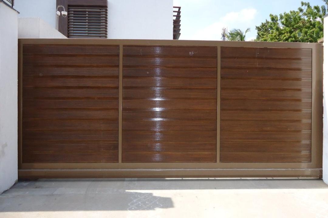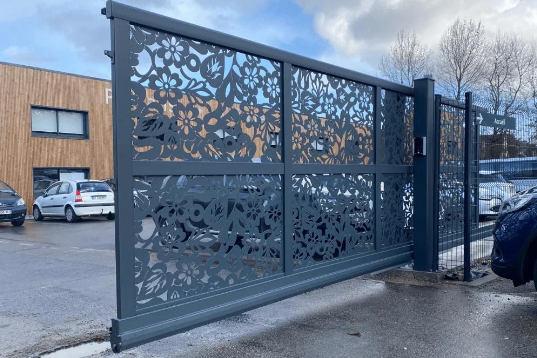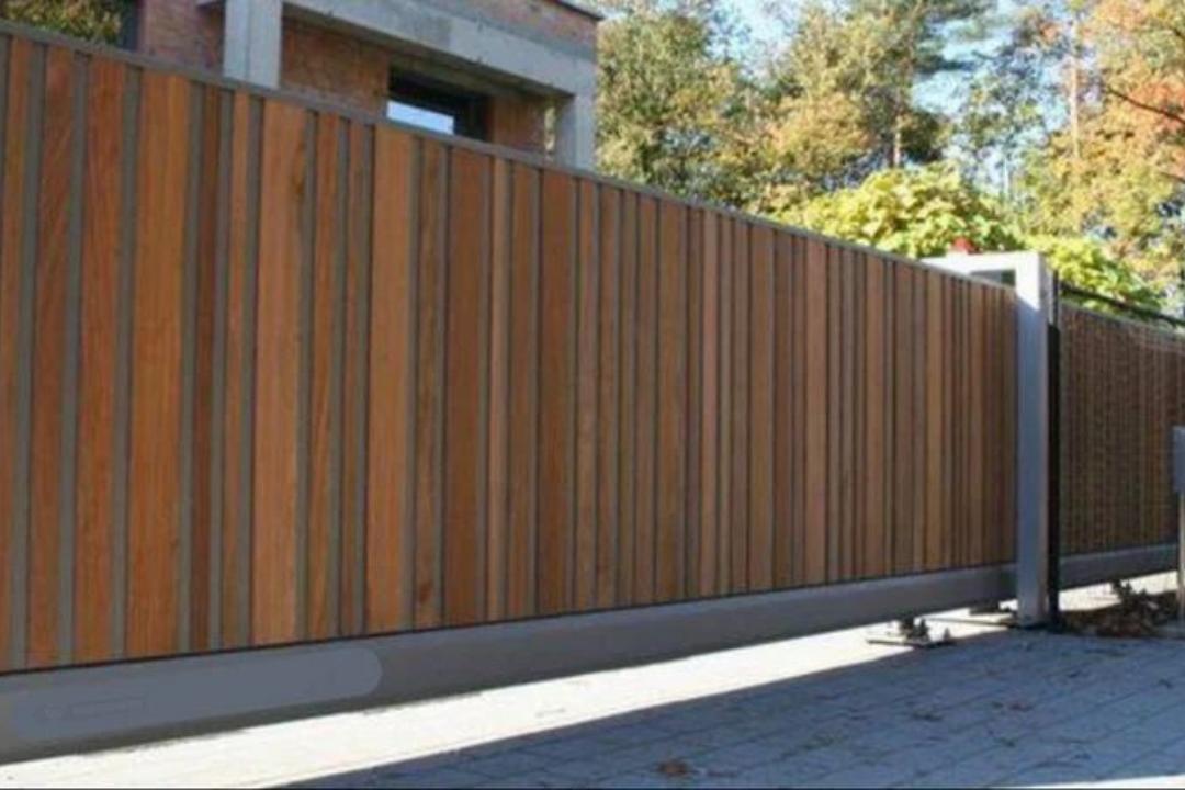 The gate is supported by a set of rollers attached to a concrete foundation on one side of the opening. The gate itself slides smoothly in the air, above the ground.