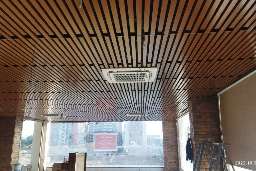 Vertical hollow tubes suspended in neat rows that create a premium linear ceiling.