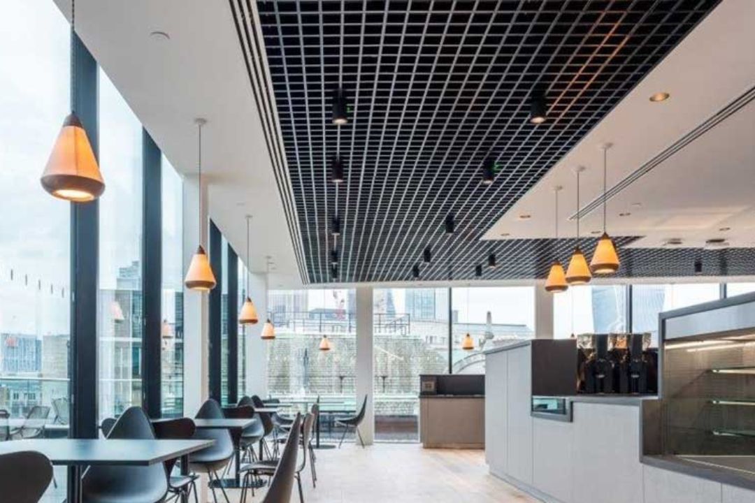 Suspended ceiling made of open grid cells that create depth and keep spaces airy.
