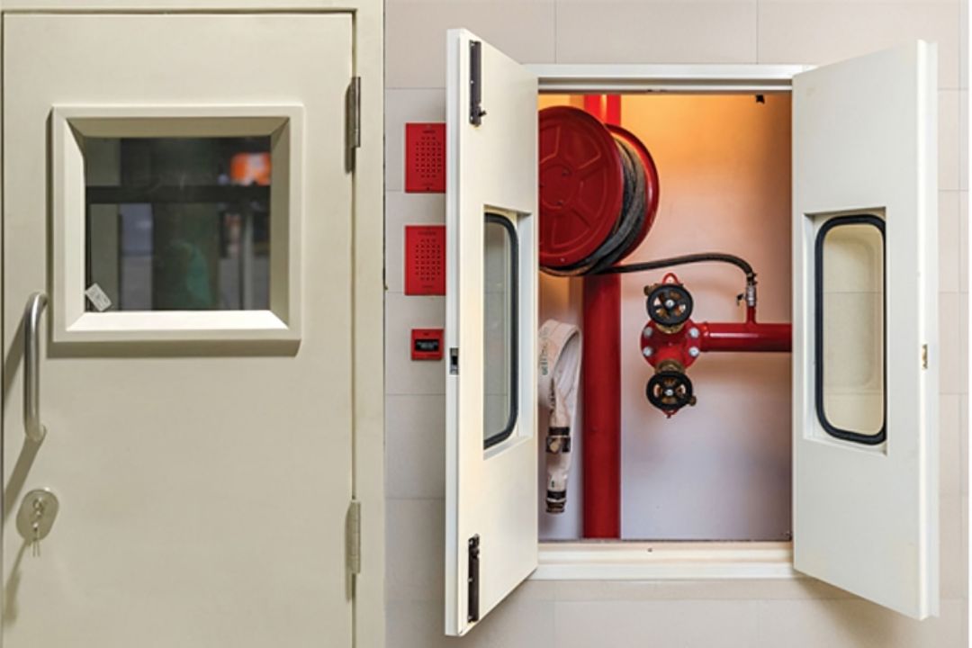 Fire rated doors for lift shafts, stairwells, and service ducts that block flames and smoke. They create safe escape routes and help contain incidents to one zone.